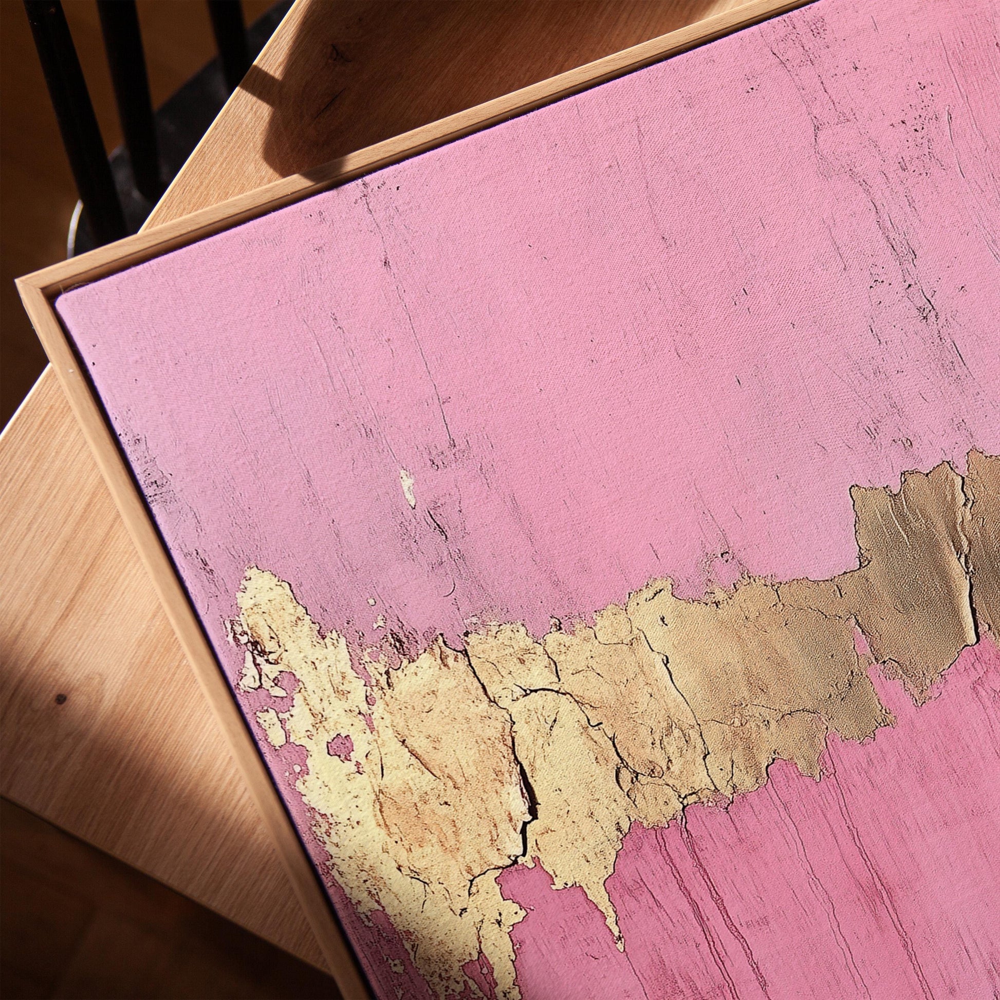Experience the blend of pink gold decor sophistication and modern minimalist canvas print style with this textured abstract painting that enriches any interior design scheme. Explore more unique contemporary wall art pieces at Noir Pixel Prints.