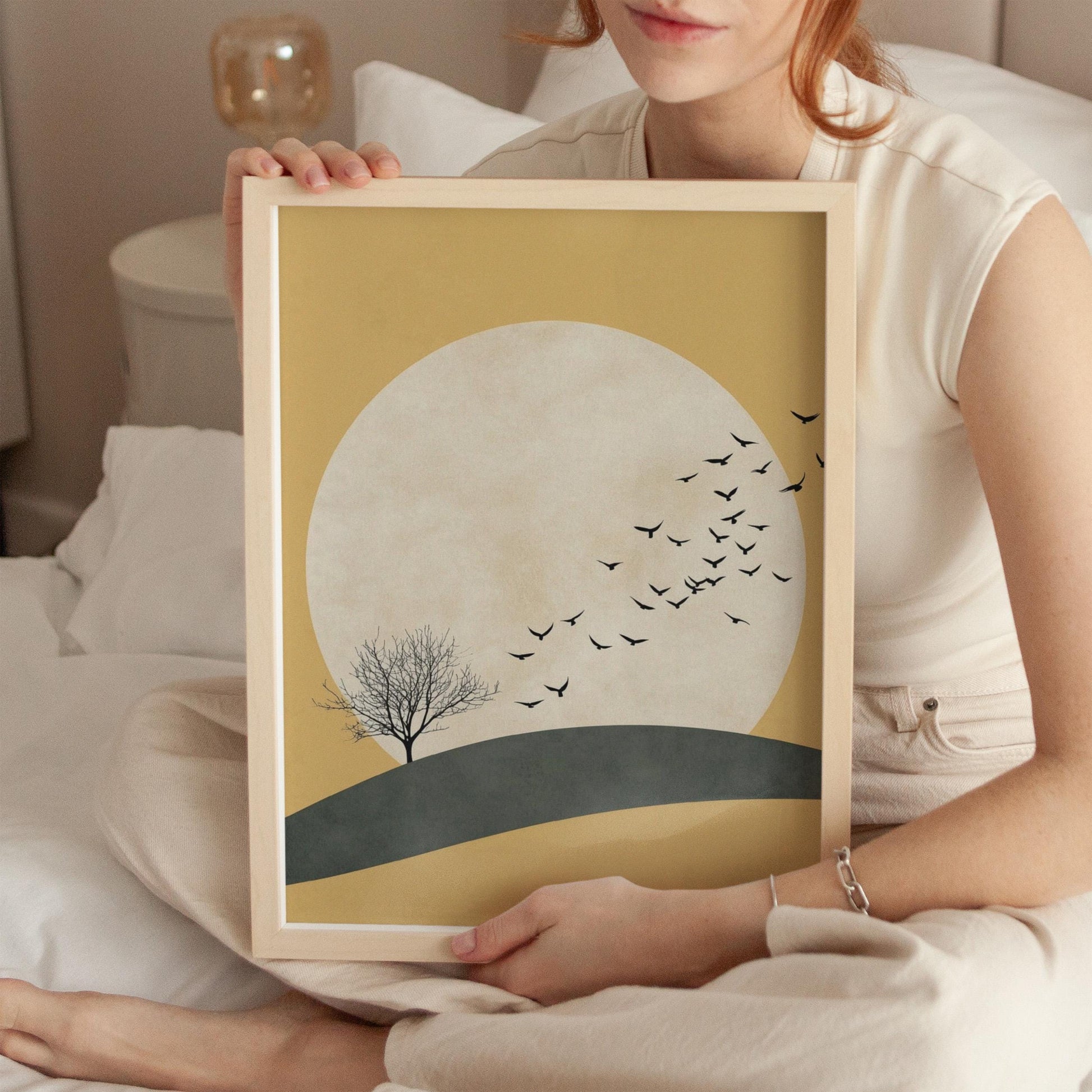 This Japandi wall art print titled 'Yellow Sun and Flying Birds' brings a serene and modern aesthetic to your living space, combining minimalist wall decor with Japanese art print influences to create a calming atmosphere. Crafted to elevate your home environment, this large fine art print features a vibrant yellow sun artwork and a dynamic flying birds canvas that perfectly suits living room canvas or bedroom wall art needs. Printed on premium 410 g/m² matte cotton canvas using fade resistant print technology, it promises vivid colors and sharp details that last up to 200 years.