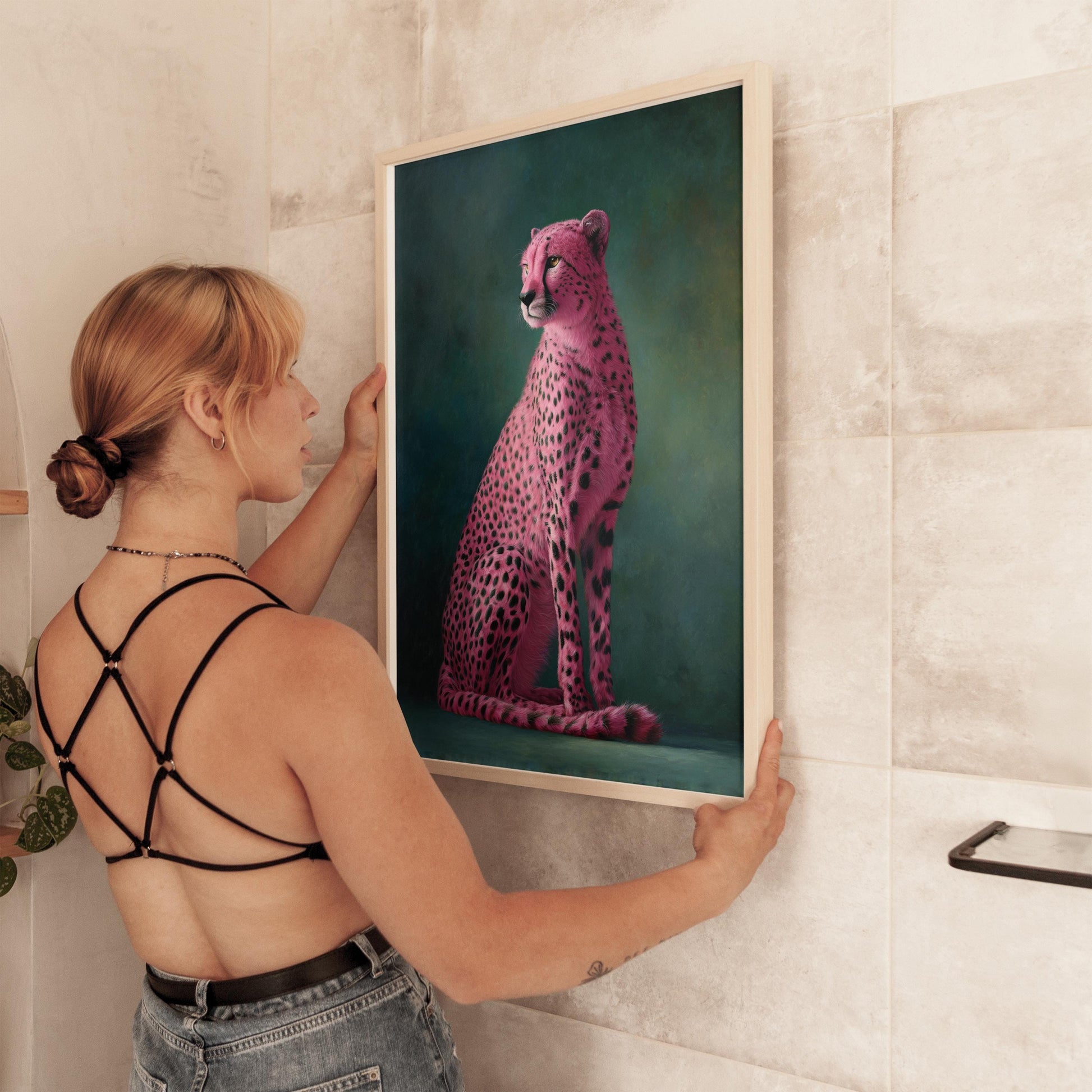 Crafted with precision, the Pink Cheetah Art Print is available in multiple sizes and can be selected with or without a sustainably sourced frame. The lightweight 1.5 inch thick floating wood frame adds a refined gallery-style touch while maintaining ease of installation. Perfect for layered wall display art setups or as a standalone statement piece, this bold textured wall art transforms any environment into an inspiring setting.